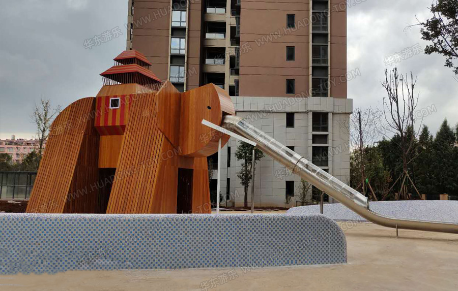 • 云南曲靖麒麟嘉园是一个中高端的生活服务区,该项目采用非洲大象为主题儿设计,利用庞大的身躯、威猛的形象给小朋友带来很强的安全感,设计了爬网、不锈钢滑梯、沙池等游乐设施,能够让小朋友十分喜爱的玩耍。