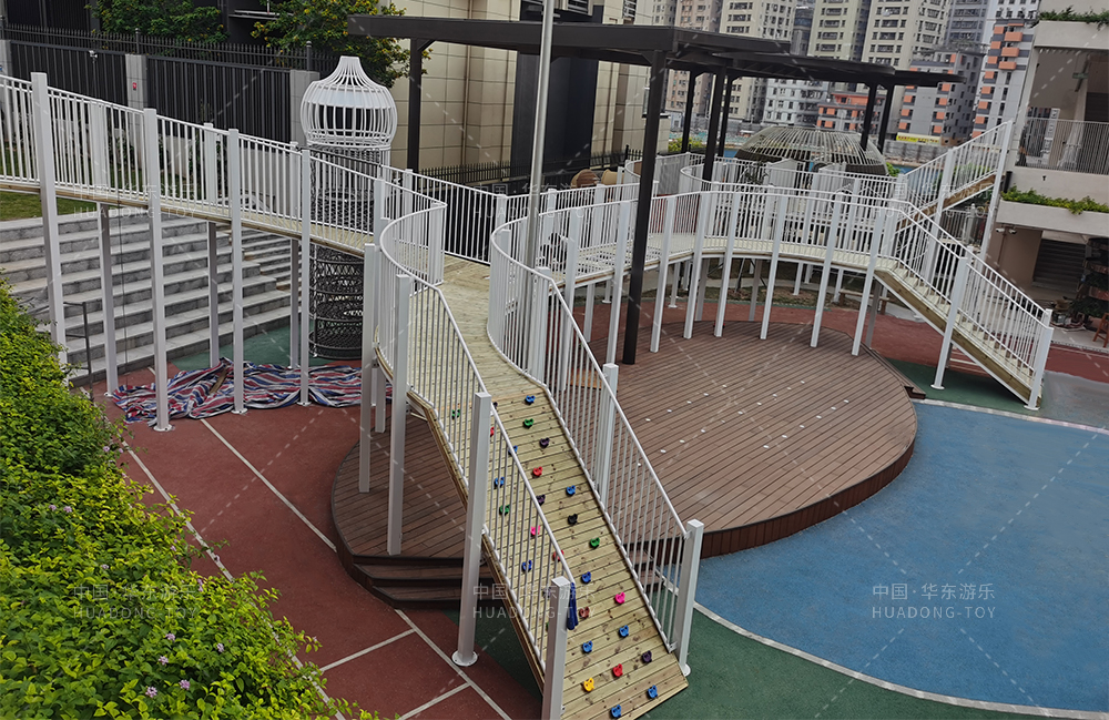 • 和风轩幼儿园专业的学前教育培训学校,该学校的项目采用的是以空中楼阁为主题而设计的 游乐设备,整个游乐设备采用钢架构和木制结构制作而成,设计了钻洞、攀爬、空中廊桥等功能,该项目的设计不仅仅丰富的小朋友的玩耍,同时也为整个校园增添了活力。
