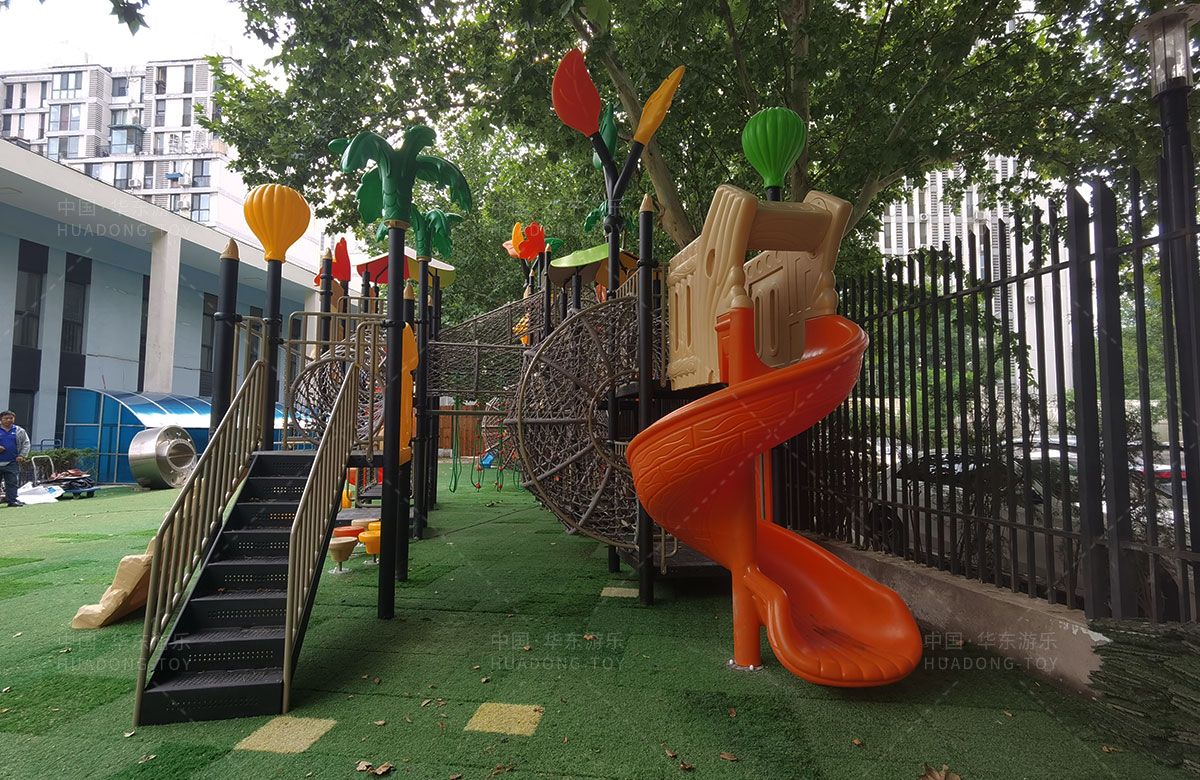 北京市朝阳区管庄忠德幼儿园选用的是ky开元游乐自主研发和设计的大自然系列组合滑梯,该滑梯是一款具备了攀爬网、钻洞、滑梯、丛林拓展、拍拍鼓、攀爬墙、固定踏踏车、平衡桩等功能为一体的综合性 游乐设备,能够很好的锻炼小朋友的全面发展。